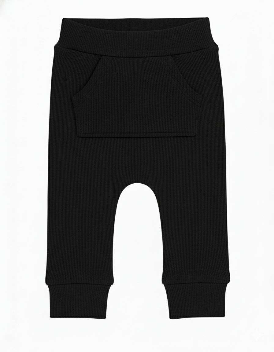 Calça Bebê e Infantil Bolsão Canguru Unissex – Algodão Canelado Premium Liso | Preta