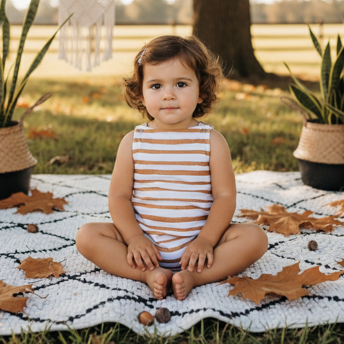 As alças ajustáveis em dois níveis acompanham o crescimento do bebê, enquanto o corte elegante e confortável garante liberdade para brincar, explorar e descobrir o mundo com suavidade. Na parte inferior, três botões discretos tornam a troca de fraldas prática e delicada, sem a necessidade de remover a peça.