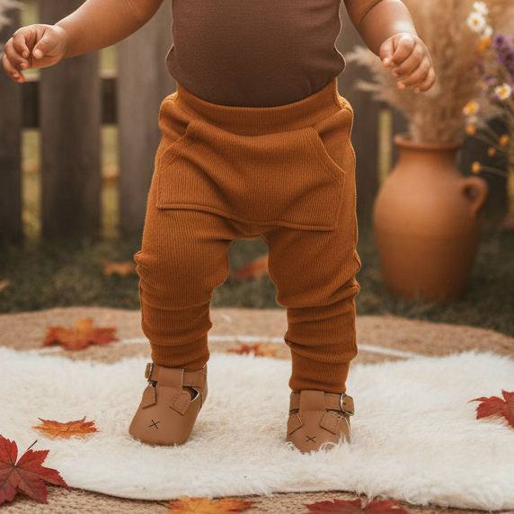 Calça Bebê e Infantil Bolsão Canguru Unissex – Algodão Canelado Premium Liso | Caramelo