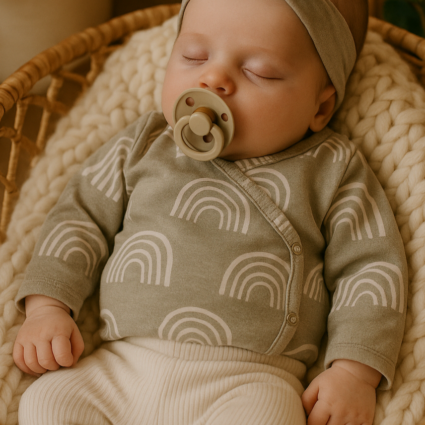 Com fechamento lateral tipo envelope, ele respeita o tempo do bebê e facilita a troca sem movimentos bruscos, sem passar pela cabeça — porque conforto, nessa fase, é tudo.