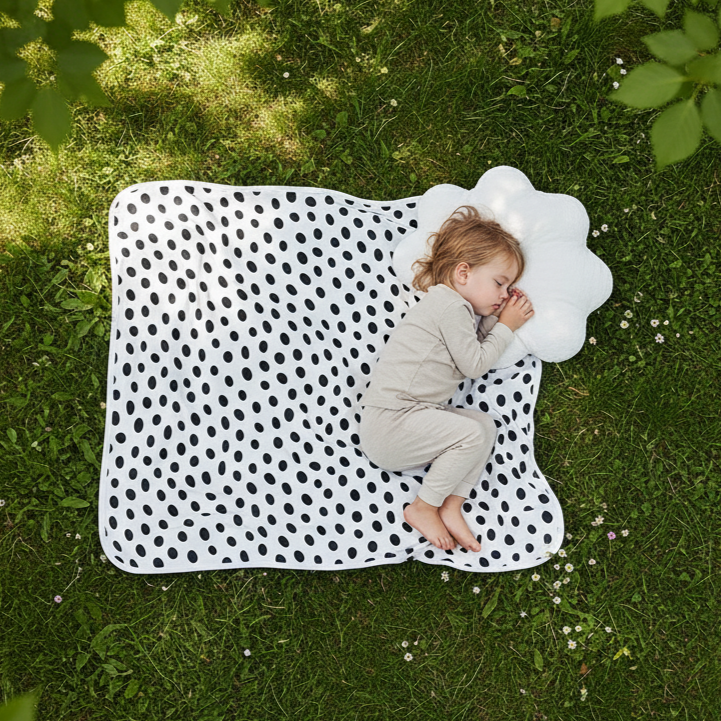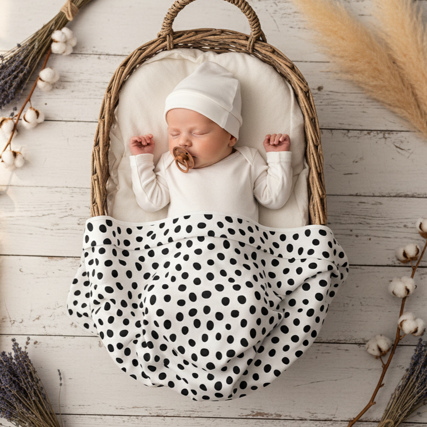 Sua dupla face traz a versatilidade perfeita: um lado em branco puro e suave, o outro com a estampa exclusiva Huge Poá, que une elegância e leveza com o toque artístico e minimalista característico da Means Love Baby.
