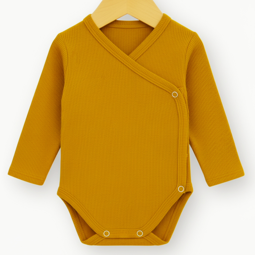 Body Kimono Bebê Recém-Nascido à 3 Meses Unissex - Algodão Canelado Premium Liso | Mostarda