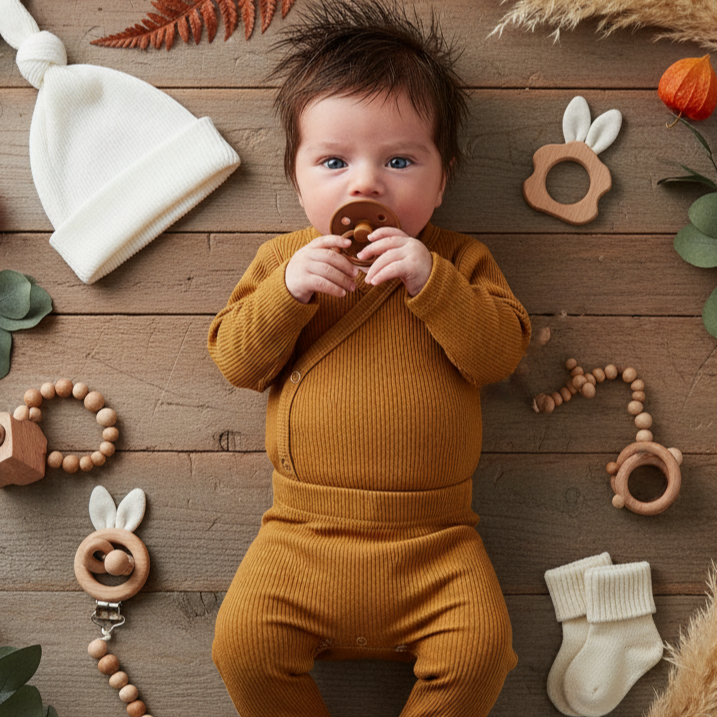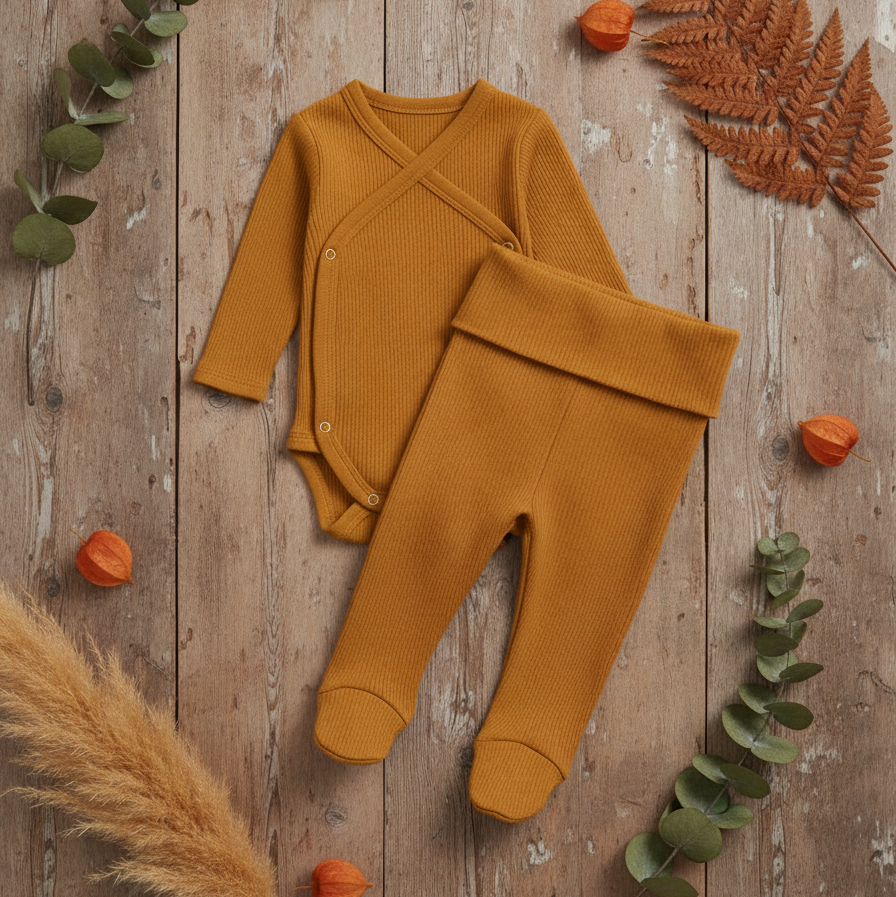 Este kit foi criado para oferecer ao seu bebê recém-nascido o que há de mais puro, confortável e essencial. Composto por um body kimono e uma calça com pezinho, ambos em tecido canelado premium caramelo, é a escolha perfeita para a maternidade, o primeiro dia em casa ou os ensaios de boas-vindas.
