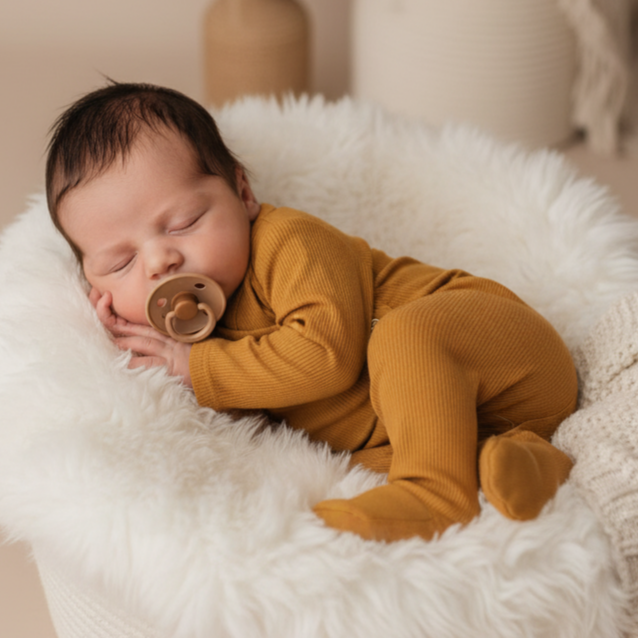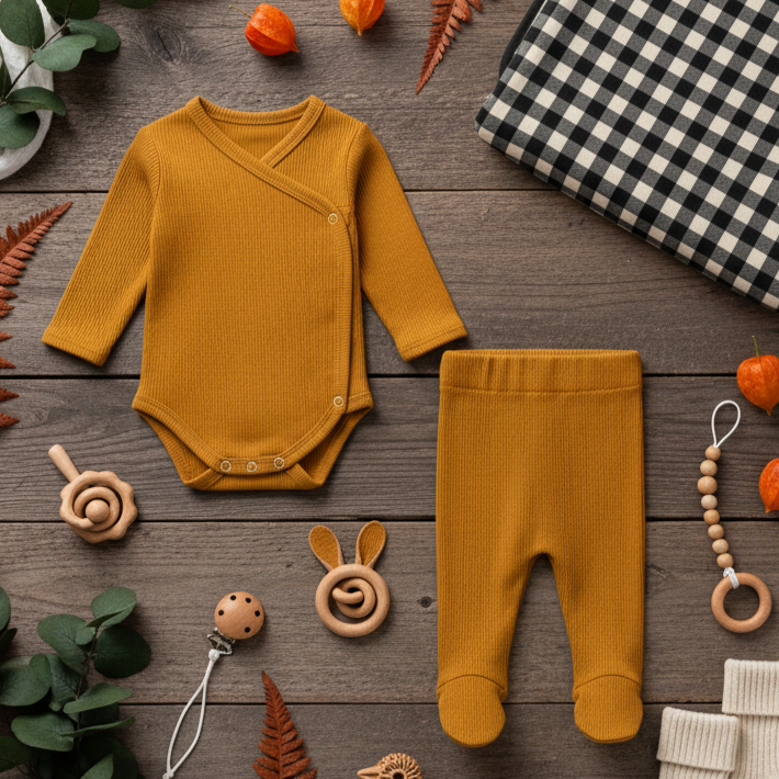 Este kit foi criado para oferecer ao seu bebê recém-nascido o que há de mais puro, confortável e essencial. Composto por um body kimono e uma calça com pezinho, ambos em tecido canelado premium mostarda, é a escolha perfeita para a maternidade, o primeiro dia em casa ou os ensaios de boas-vindas.