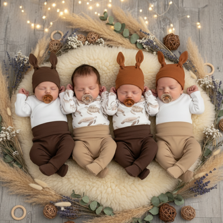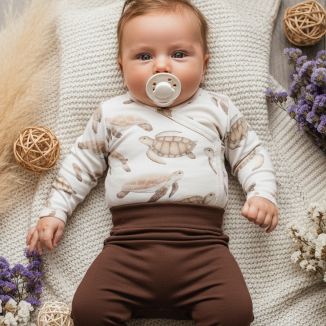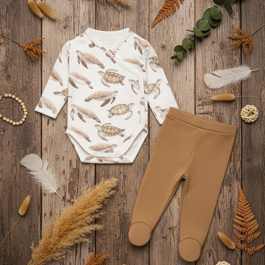 Cada detalhe foi pensado para envolver o bebê com aconchego, estilo e praticidade — das aberturas cruzadas tipo kimono que facilitam a troca, às calças com pezinho que mantêm o bebê sempre aquecido.