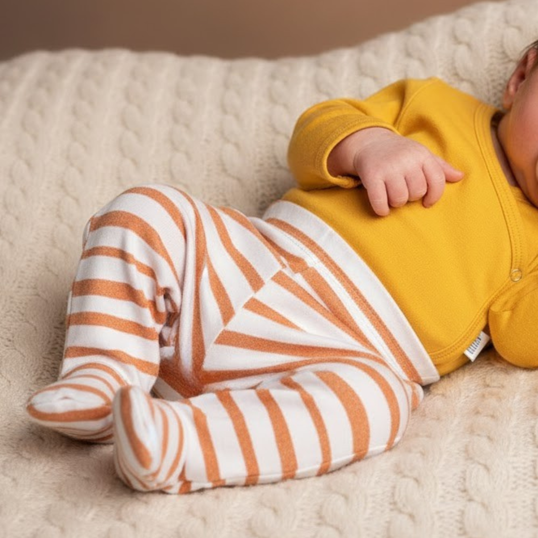 Essa calça com pezinho, feita em algodão leve e estampada com listras amarelas, foi criada para vestir os primeiros dias do bebê com afeto, conforto e beleza. O tecido é macio, respirável e delicado para a pele sensível do recém-nascido, garantindo conforto térmico em todas as estações.