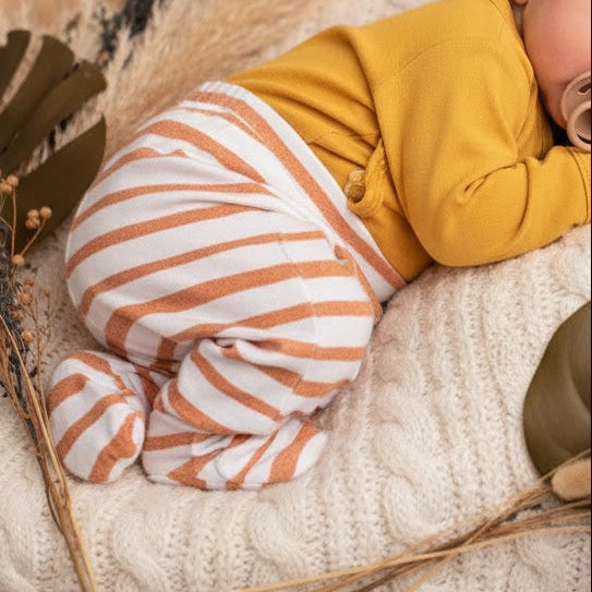 Calça Recém-Nascido com Pezinho Unissex – Algodão Premium Estampa Exclusiva | Listras Amarelas