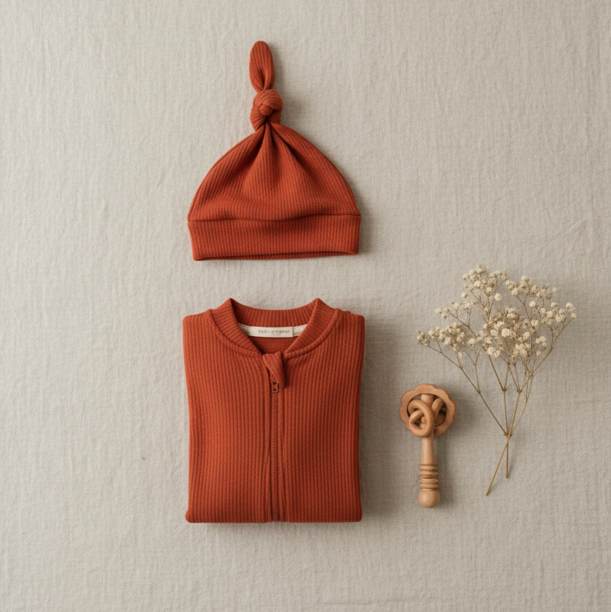Composto por duas peças coordenadas, este conjunto traz uma estética minimalista e sofisticada, ideal para quem busca um enxoval cápsula com identidade e bom gosto. Um kit versátil para a maternidade, para os primeiros dias em casa ou para presentear com significado.