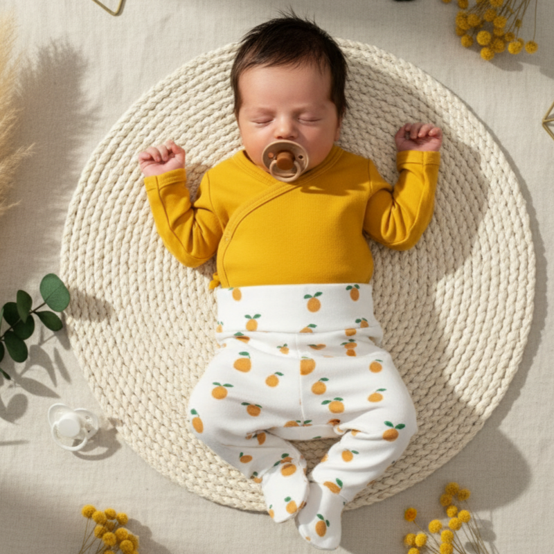 O Kit Recém-Nascido Means Love Baby foi criado para transformar os primeiros meses em momentos de puro encanto e conforto. Composto por um body modelo kimono em algodão premium liso na cor amarelo vibrante e uma calça de pezinho com estampa exclusiva de mini laranjinhas boho, este conjunto une delicadeza artesanal, sofisticação minimalista e suavidade incomparável.