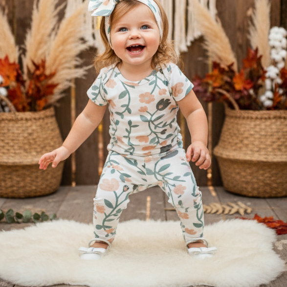 O Conjunto 3 Peças Floral Vintage Azul é composto por body manga curta, legging macia e par de presilhas de cabelo com estampa exclusiva Means Love Baby.