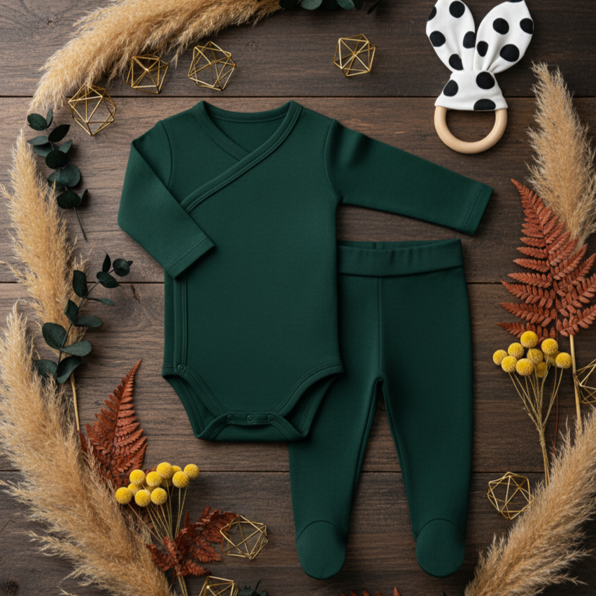 O design estilo kimono garante praticidade nas trocas, enquanto a tonalidade verde mate transmite elegância natural e exclusividade. Um item premium que combina luxo, afeto e modernidade, perfeito para compor um enxoval atemporal e sofisticado.